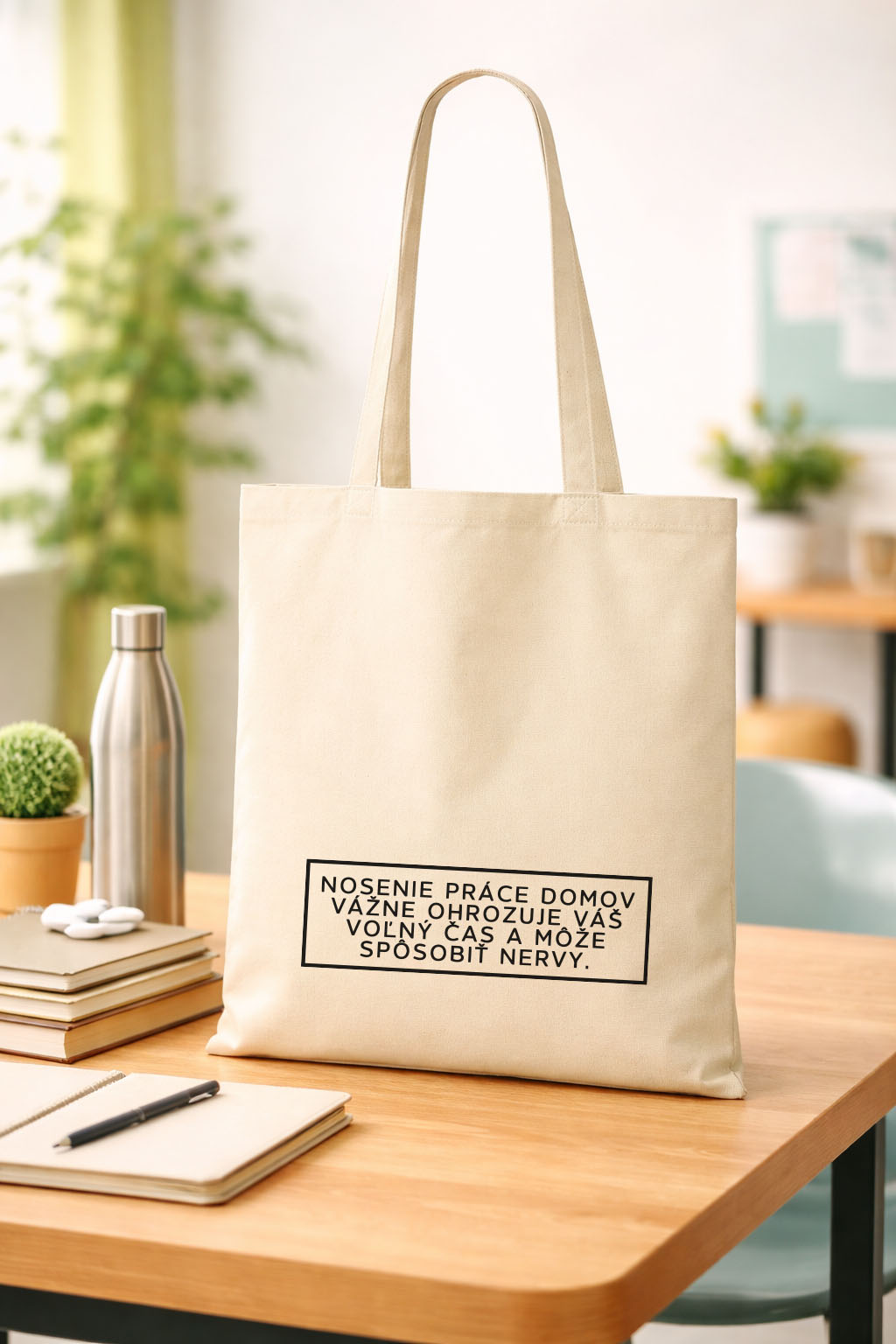 Taška z prírodného materiálu s varovaním pre tých, čo si často nosia prácu domov Materiál: 100% bavlna Potlač: flex, čierna farba Starostlivosť: ideálne prať naruby na jemnom praní bez aviváže