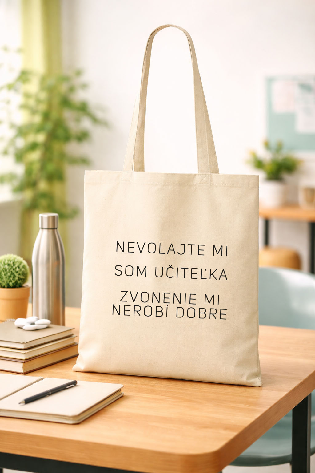 Taška z prírodného materiálu s vtipnou potlačou pre každú správnu pani učiteľku Materiál: 100% bavlna Potlač: flex, čierna farba Starostlivosť: ideálne prať naruby na jemnom praní bez aviváže