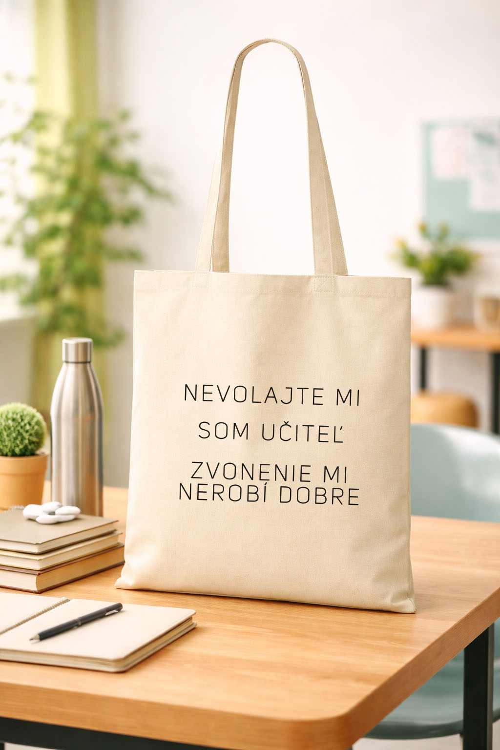 Taška z prírodného materiálu s vtipnou potlačou pre učiteľa. Materiál: 100% bavlna Potlač: flex, čierna farba Starostlivosť: ideálne prať naruby na jemnom praní bez aviváže