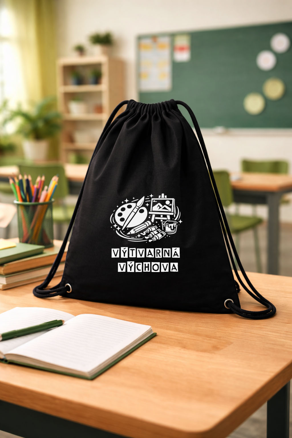 Čierne vrecúško na výtvarnú výchovu Materiál: 100% bavlna Potlač: flex, biela farba Starostlivosť: ideálne prať naruby na jemnom praní bez aviváže