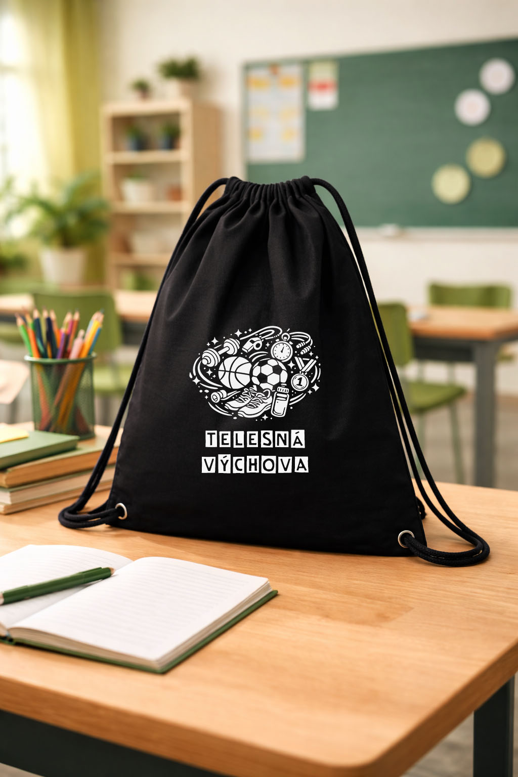 Čierne vrecúško na telesnú výchovu Materiál: 100% bavlna Potlač: flex, biela farba Starostlivosť: ideálne prať naruby na jemnom praní bez aviváže