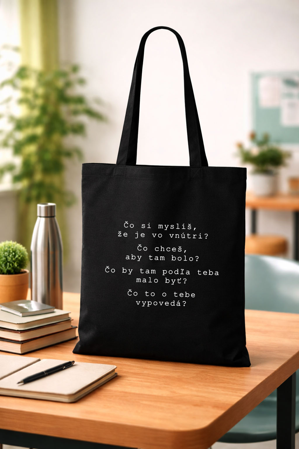 Čierna taška s filozofickým nápisom do ruky aj na plece Materiál: 100% bavlna Potlač: flex, biela farba Starostlivosť: ideálne prať naruby na jemnom praní bez aviváže