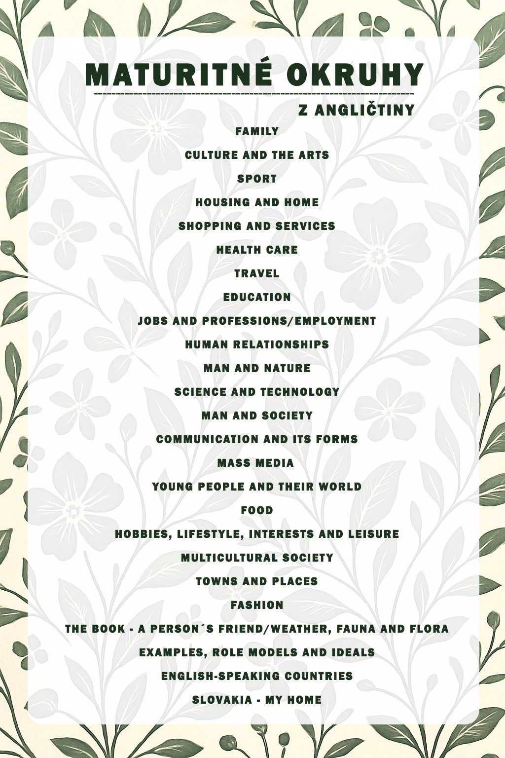 Obsahom lekcií sú vybrané maturitné témy, okruhy alebo otázky, pričom náročnosť lekcií závisí od toho, či sa rozhodnete pripravovať na maturitu na jazykovej úrovni A1, A2, B1 alebo B2.